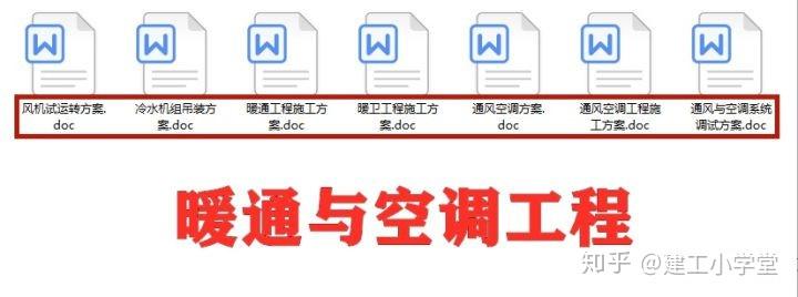 主要包括了 风机试运转方案、冷水机组吊装方案、暖通工程施工方案、暖卫工程施工方案 等等。