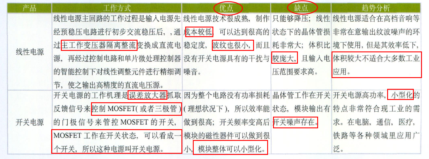 下面一张图详细的比较了线性电源和开关电源的优点和缺点以及应用趋势。