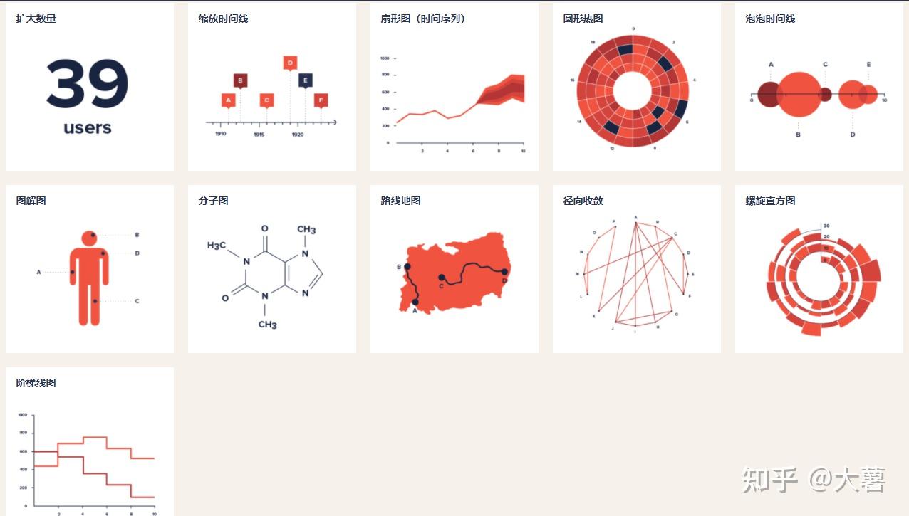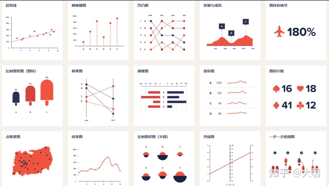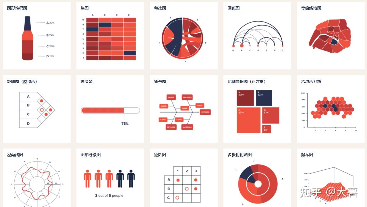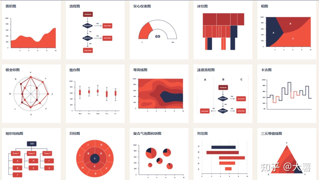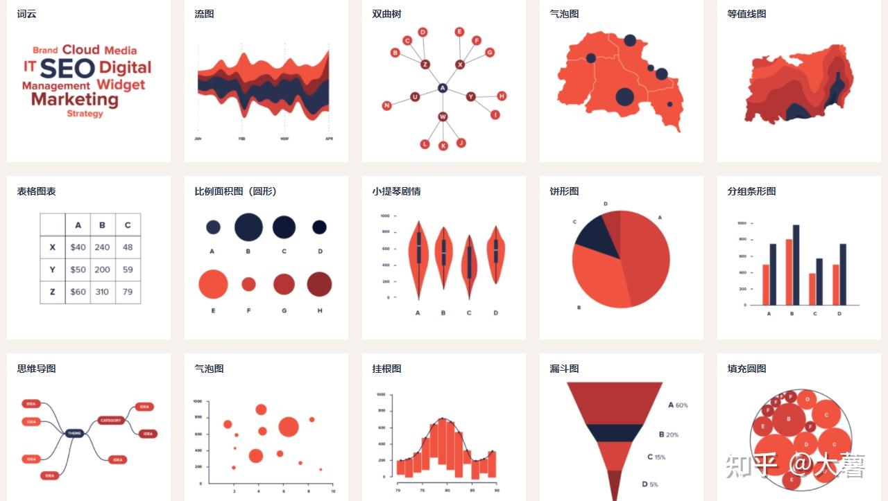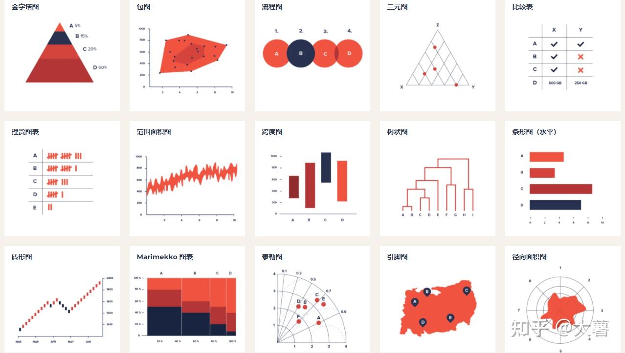 象形柱图、饼图、维恩图、同心圆、气泡图、折线图、K线图、面积图、散点图、旭日图、扇形图、风玫瑰图、柱状图、磁带图、甘特图、矩形树图、网格图、元素周期表、弧线图、桑基图、弦线图、雷达图、极坐标网格图、螺旋图、时间线、并列比较、抽象树、思维导图、关系图、路径图、树图、决策树、方框图、金字塔、漏斗、辐轮、循环轮、楼梯、国际图形字体教育体系、地铁路线图、速度仪表、齿轮、拼图、杠杆、天平、切尔诺夫脸谱图、头部轮廓、系谱树、组成结构、迷宫、地理坐标/地图、冰山、高山、岛屿、三明治、宇宙、钟面仪表盘、、层次、过山车、书架、根源、树、循环系统、建筑物中的活动、城市生活、马拉松、进化、食物链、聚集、实验、工厂、成套工具、传送带、道路、机器、盒须图、热力图、平行坐标系、词云