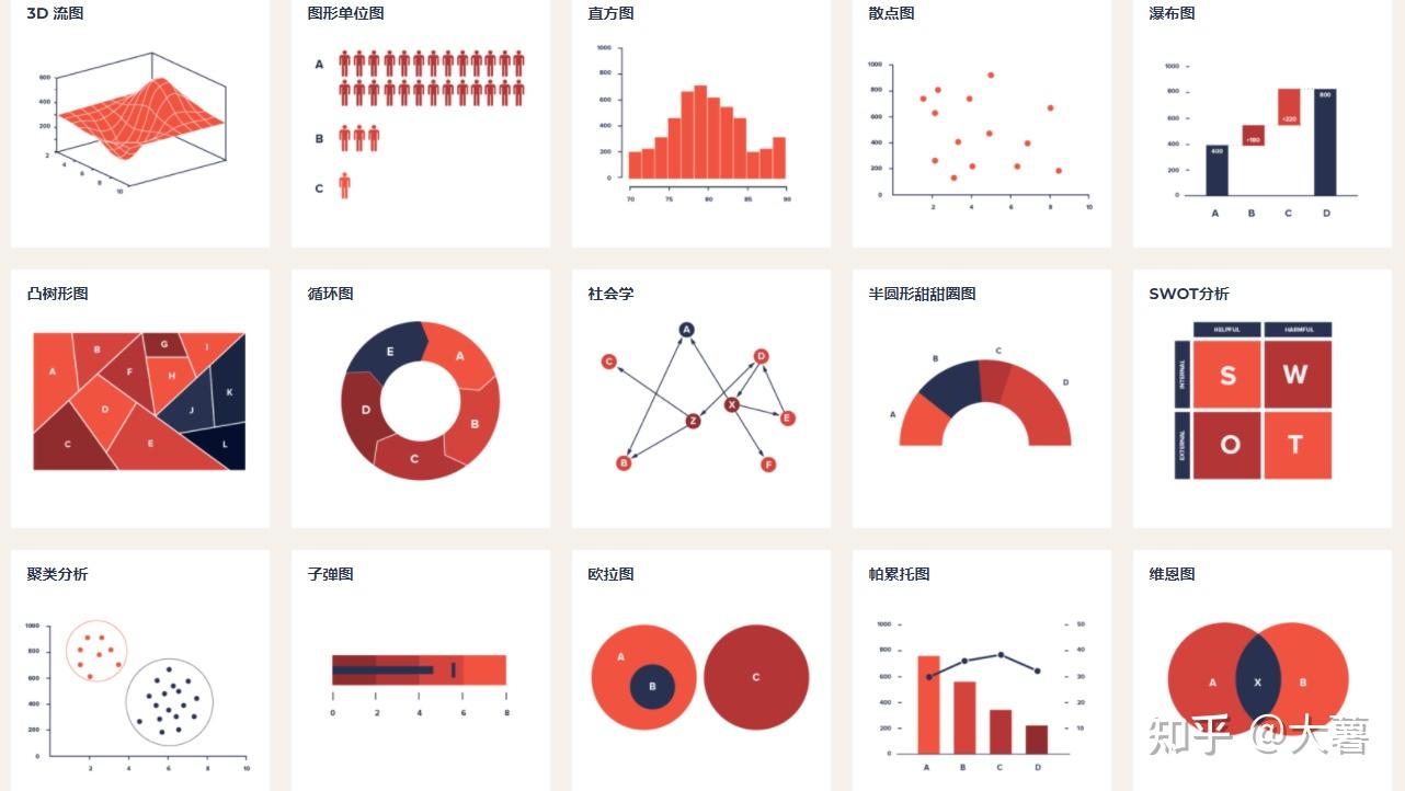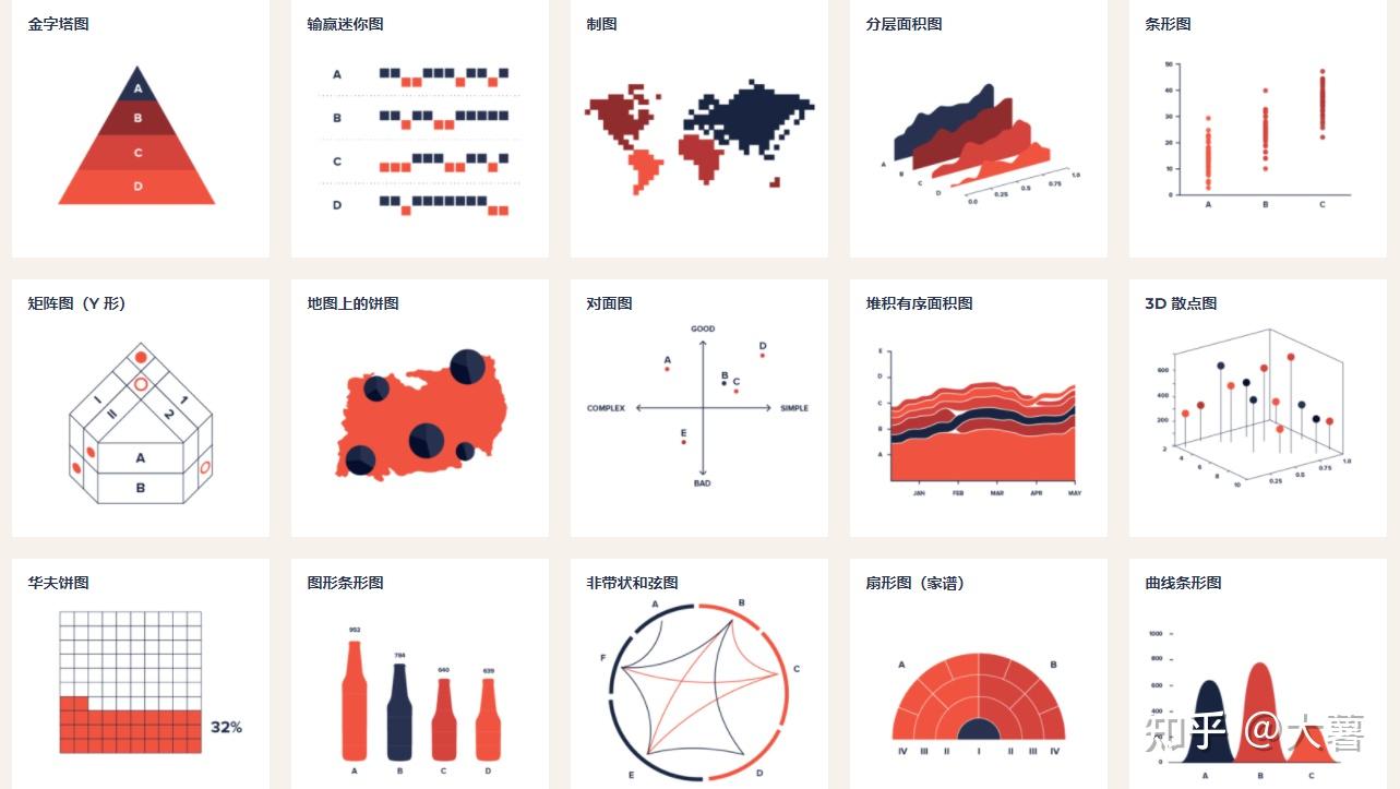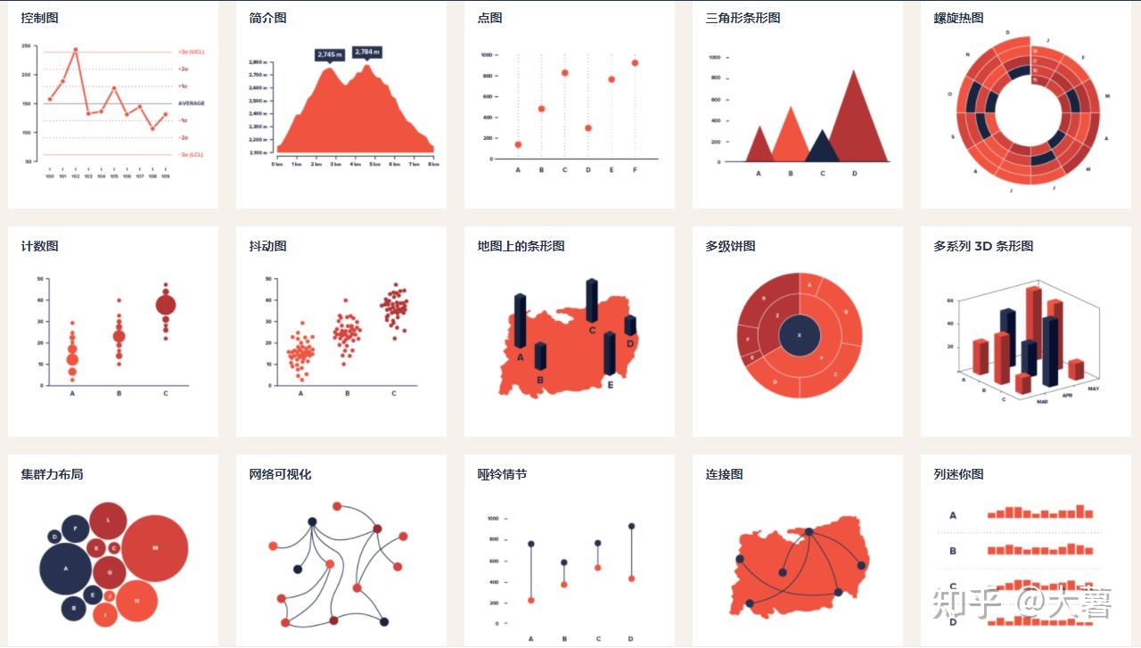 比较,构成,分布联系,概念可视化,相关性,关联,分配,地理数据/信息,部分到整体,随时间变换趋势,分布。