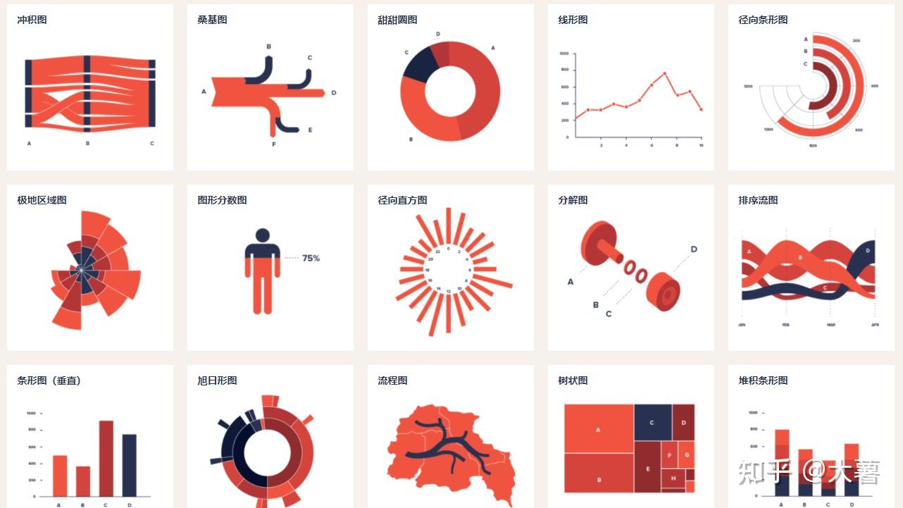 图表最基本的表现形式: 柱状图、折线图、饼图 等几种形式,其他的数据图都是这几种常规图形的变形。