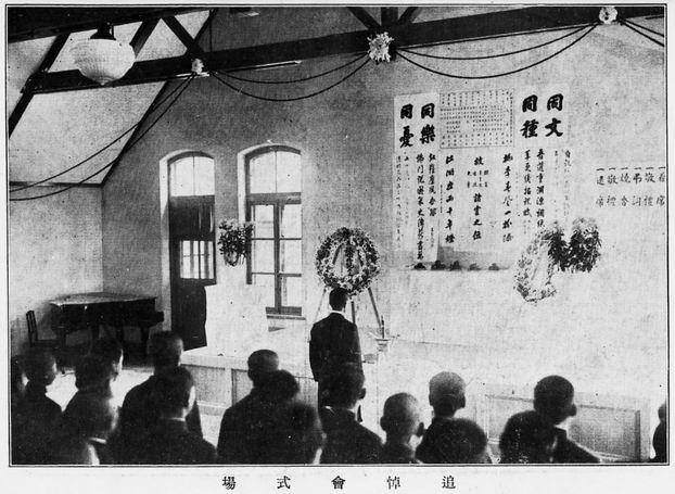 上图:旅顺师范学堂建校十周年纪念大会次日,全校师生和毕业生代表举行追悼会,悼念建校以来去世的五十九名日本教职员和日中两国校友。