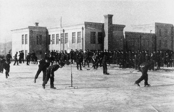 上图:按照日本学制举办的日本人学校--大连早苗高等小学校。图为学生在校园滑冰。