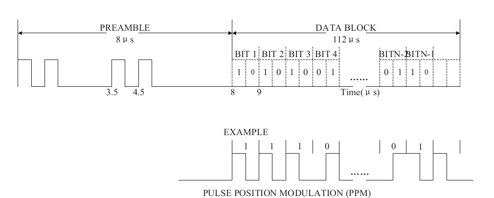 较为简单,将0、1脉冲直接调制在载波上。在 1\mu s 的时间内,脉冲出现在后半部分的表示0,出现在前半部分的表示1,也可以用01表示0,10表示1。完整的ADS-B消息长度是120 \mu s ,包括前导脉冲和数据脉冲两部分,采用PPM脉冲位置调制。前导脉冲长度8 \mu s ,作用是为后面的数据块解码提供信号到达时间和脉冲参考电平等参数。数据脉冲长度112 \mu s 。