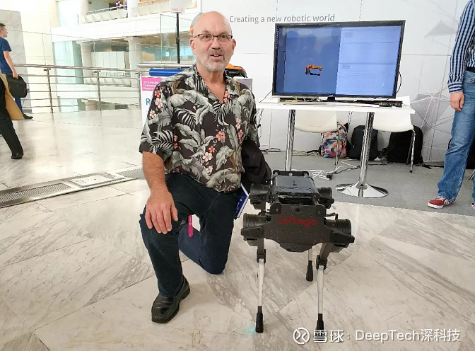 图 | IROS 2018 会场波士顿动力创始人 Marc Raibert 与莱卡狗合影(来源:宇树科技)