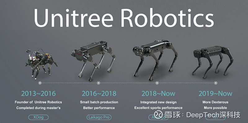 公司成立至今 3 年多时间里,已经开发了 Laikago、Laikago Pro、AlienGo、Unitree A1 四款机器人。目前主推两款产品,一是偏向教育酷玩市场的 Unitree A1 机器人, 二是定位为通用移动平台的用于实际应用的机器人 AlienGo。