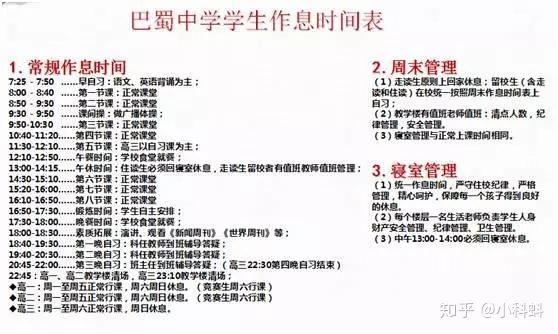 07学生管理及作息时间 巴蜀中学招收住读生,本部校区住宿为女生八人间,男生六人间,两卫带浴,每个房间配备一台冷暖空调,空调费自付,室内无充电设备。每楼一微波炉,两投币洗衣机,楼层转角处提供充电插座。鲁能校区则为六人间规格,宿舍内有书桌和板凳,每人有独立立柜,其余条件和本部住宿部相同。