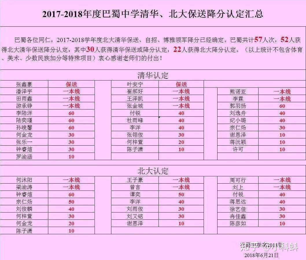 北京大学、清华大学2018自主招生(含博雅计划、领军计划)结果揭晓,巴蜀中学共 57 人获得清华、北大保送降分认定: