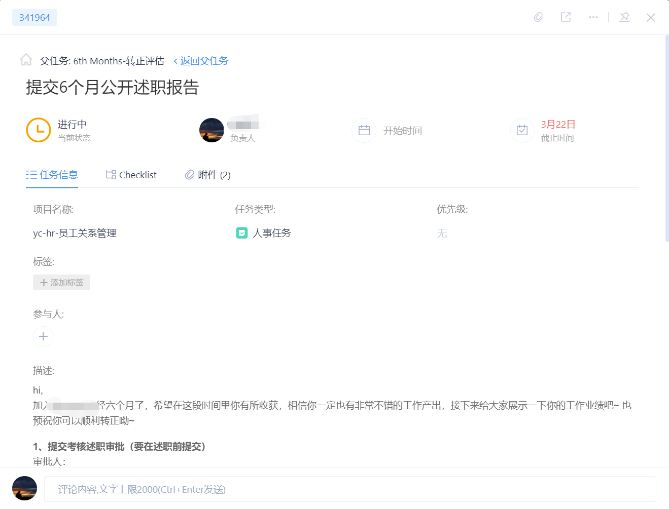 任务描述、子任务、任务指派、负责人+参与人、优先级、任务状态、开始\结束时间、讨论、@某人、任务附件。
