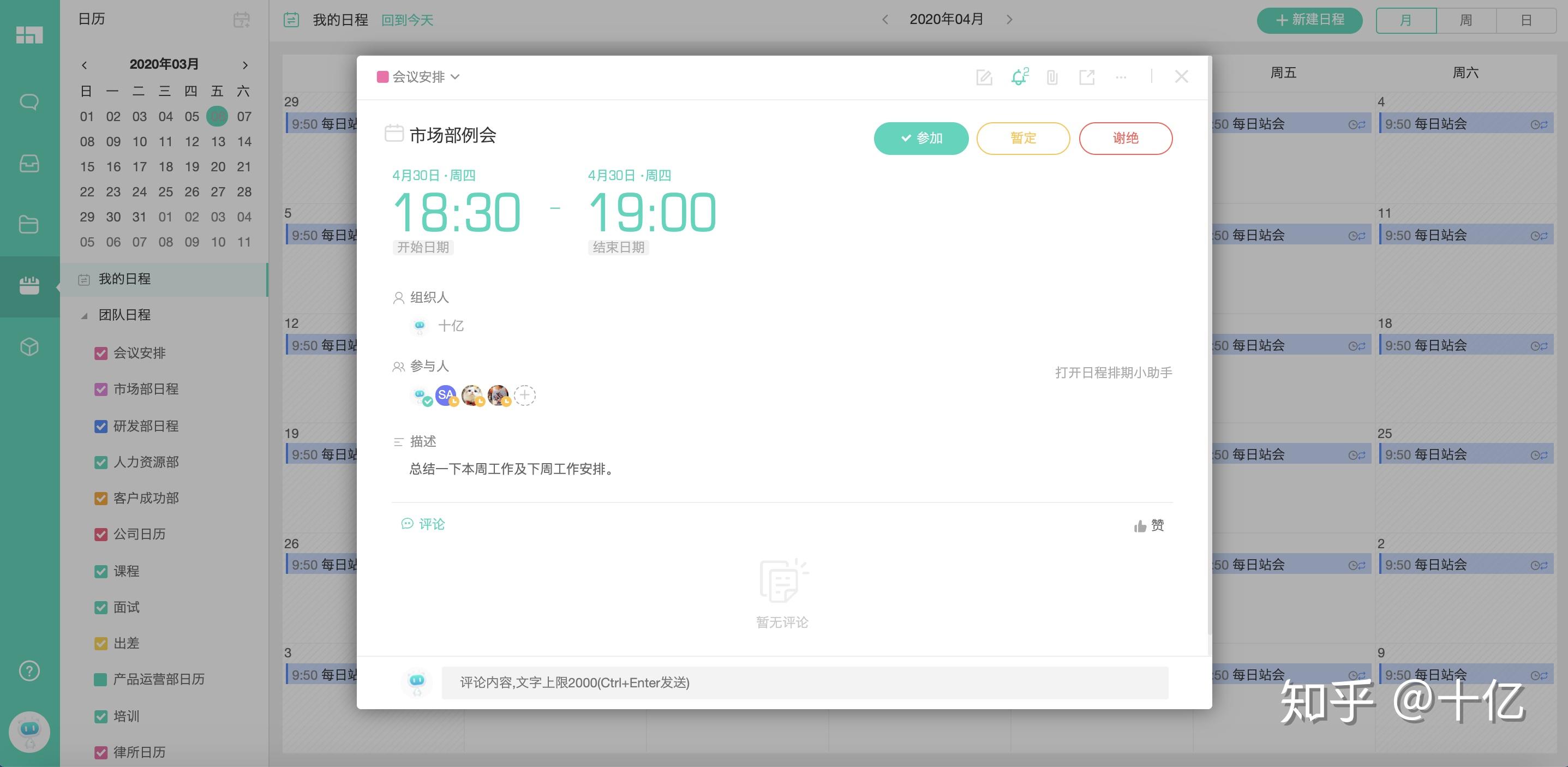 日程中可以添加描述、参与人等,类似于例会这种可以设置循环日程。