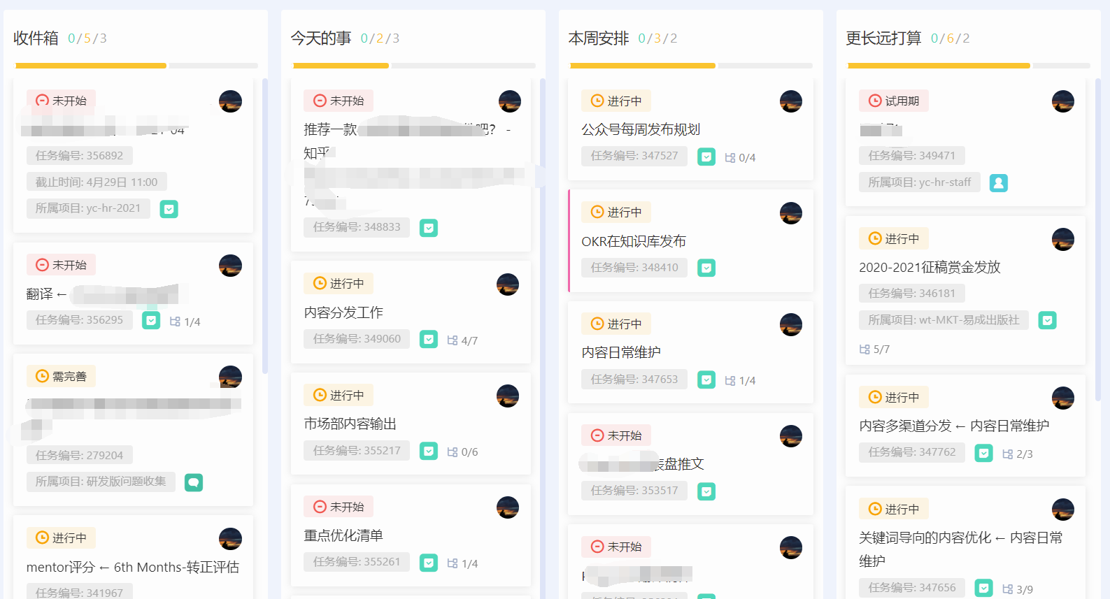 看板式任务管理,支持自定义甬道维度 :比如你可以看到我的:收件箱(领导指派的任务),今天要完成的事,这周的计划,更长远的规划,能很方便的对个人任务进行管理。