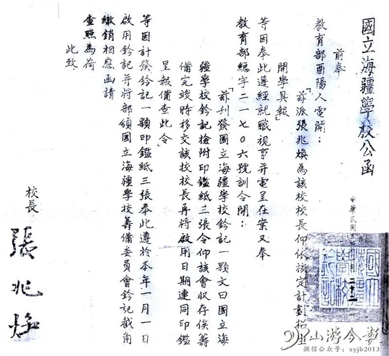 《仙游鲤城镇志》记载:“1944年5月,国民政府决定创办国立海疆学校,由教育部派蒙藏教育司科长张兆焕(仙游人)等3人来闽筹备。当年8月张抵闽后,设筹备处于仙游县,借私立金石中学旧址为校舍,办理该校招生诸事宜。10月,教育部聘张兆焕为校长。1945年元月第一届招考揭晓。2月,教育部改聘梁龙光为校长”。