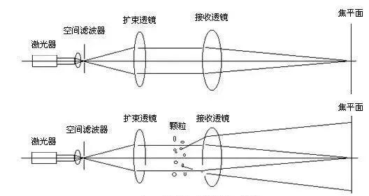 由激光器发出的一束光,经滤波、扩束、准值后变成一束平行光,在该平行光束没有照射到颗粒的情况下,光束穿过富氏透镜后在焦平面上汇聚形成一个很小很亮的光电---焦点;当颗粒通过光束中时,颗粒将使激光发生散射现象,一部分光向与光轴成一定的角度向外散射,如下图所示。