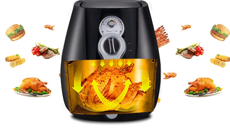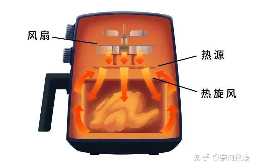 这8个字可以拆分解读就是:在通电的时候将机器内部的热管高速加温产生了热空气,再将这股热空气吹到锅内,使食材变热,因为在使用的时候是一个封闭式的空间,导致这股热空气一直在国内不断的循环,在循环的过程中将食材中自带的油脂加热,对食物进行煎炸,在煎炸的过程中能让食物脱水,从而使食物的表面变得金黄酥脆。