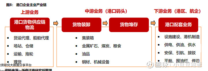 港口业务按装卸货种分为:集装箱、干散货(矿石,煤炭等)、液体散货(油、液化石油气/天然气等)等三类。产业链如下图。