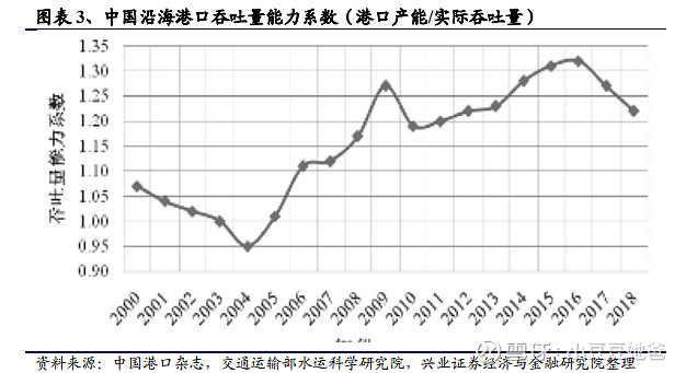 对于港口的客户来说,邻近的港口在部分情况下是可以相互替代的,由于不同港口隶属于不同的主体,即使是同一省份内不同地区的国有港口之间,也会存在竞争关系。2000 年之后伴随着中国外贸的繁荣,国内港口货物吞吐量也持续快速增长,这段时期行业的主要矛盾是产能不足。经过多年的投资建设, 港口逐步从产能不足发展到产能过剩 ,根据交通部水运科学研究院的中国沿海港口吞吐能力系数倒推, 2004-2016 年中国沿海港口产能利用率从105%下降到76%,下降了近30% ;2014 年开始,中国港口货物吞吐量增速明显放缓,行业从快速成长期步入成熟期;部分港口企业经营开始恶化,债务压力凸显,区域港口之间竞争的矛盾愈加突出,大规模的港口整合也就应运而生。