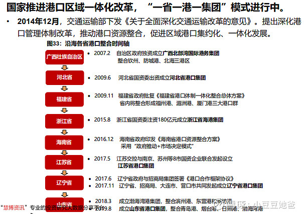 山东省港口整合目前已完成。整合前青岛港主要由青岛市国资委下属的青岛港集团及其控股的青岛港股份(601298.SH)经营,日照港主要由日照市国资委下属的日照港集团及其控股的日照港股份(600017.SH)经营,烟台港主要由烟台市国资委下属的烟台港集团经营,三港之间存在激烈竞争。