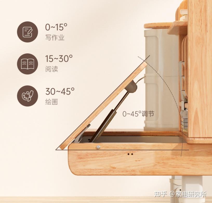 活动面板要满足0-45°可调节的条件,这样才能满足不同阶段的儿童写作业、读绘本、画画的需求。