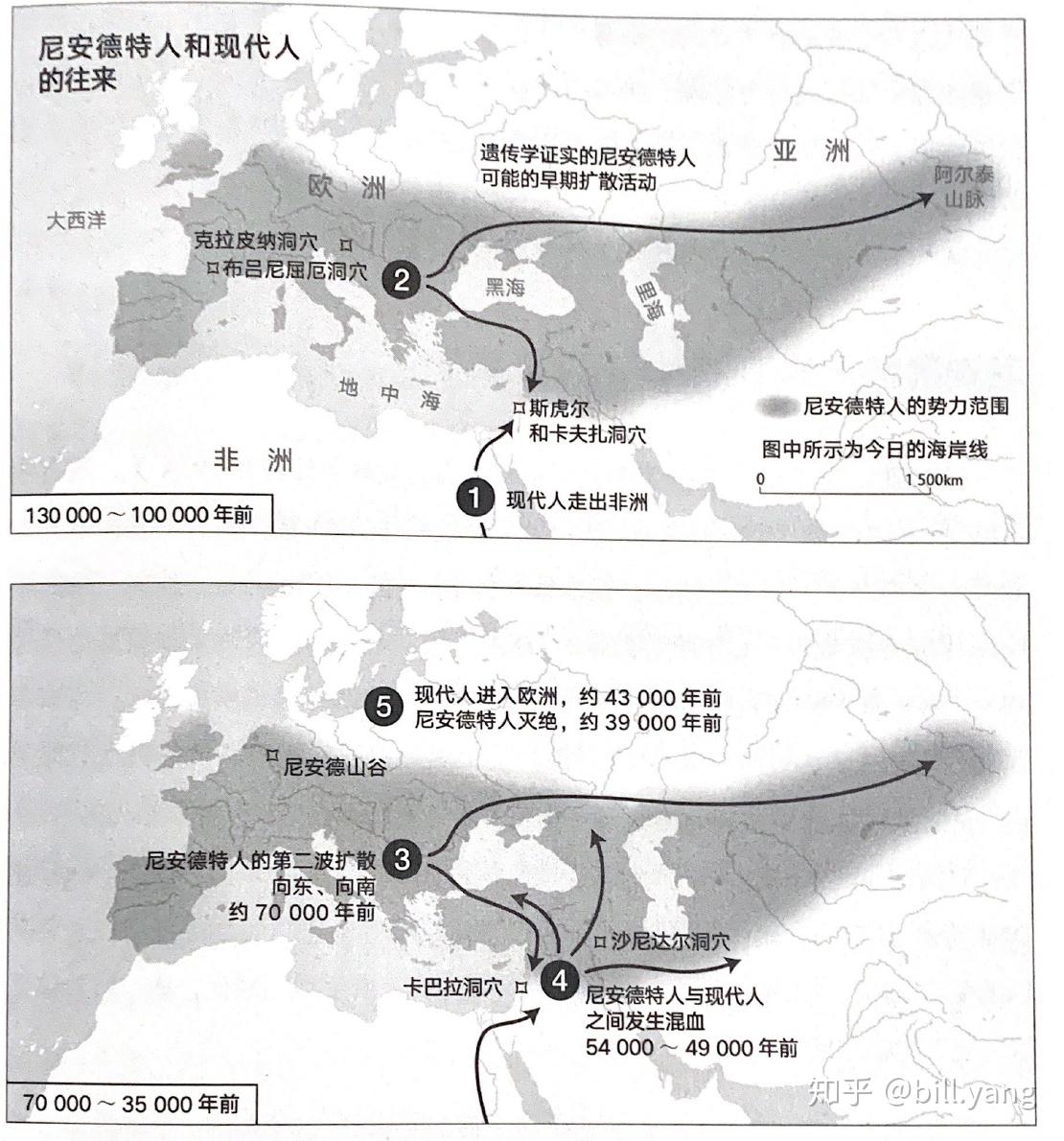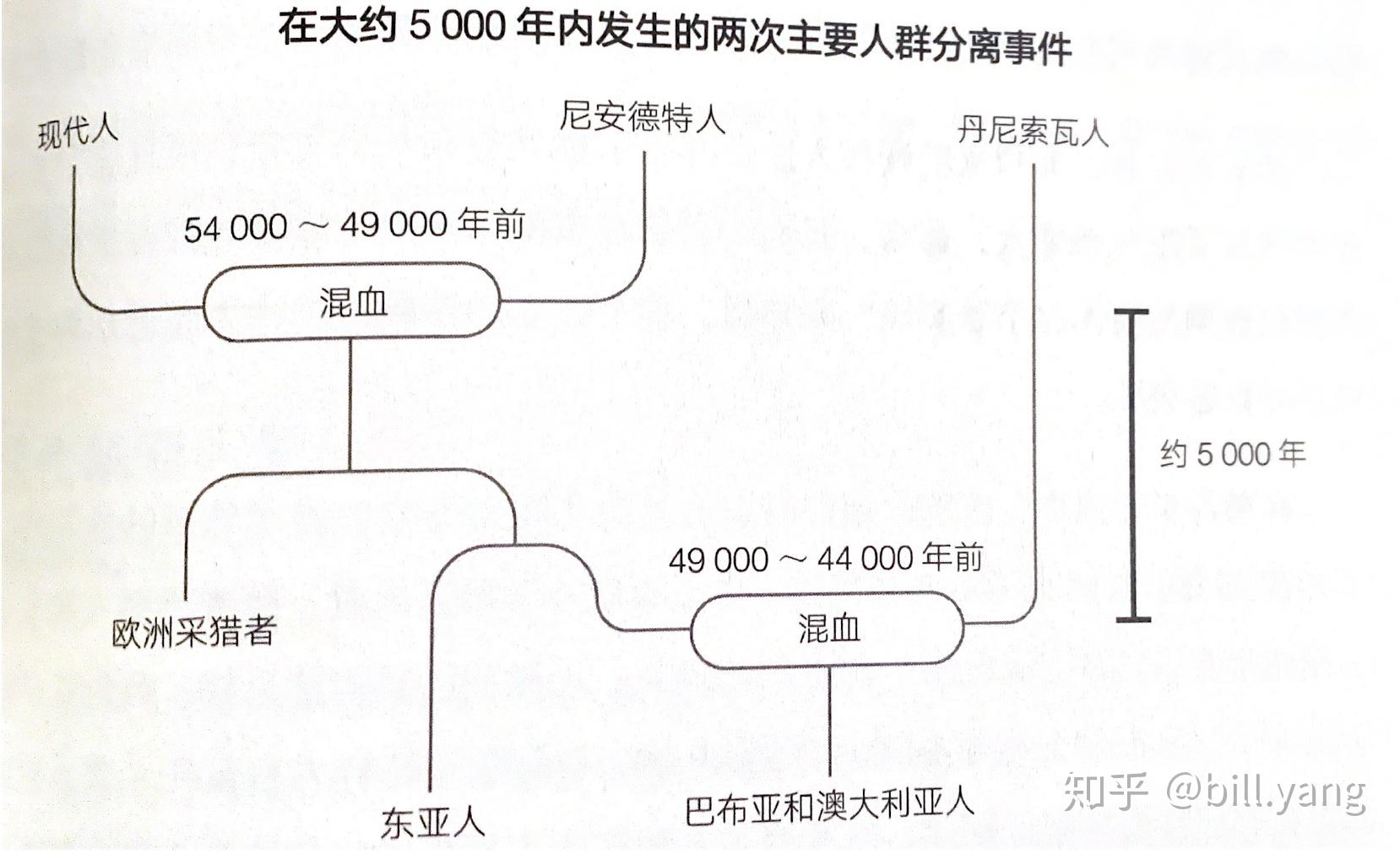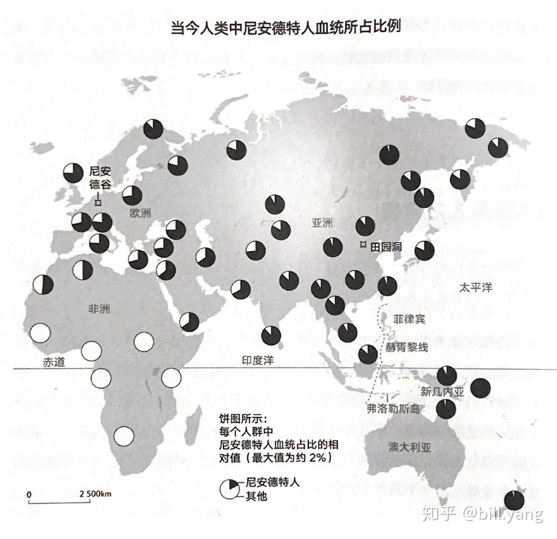 54000年到49000年前的时候,现代人首先与尼人在近东遭遇,并发生了混血,随后一支向西,形成了欧洲的采猎群体,另一支则向东,扩展至整个中亚、东亚,随后又分成两支,一支北上并进入美洲,一支南下到达澳大利利亚地区,今天非洲以外的所有人身上仍然都带着2%左右的尼人血统。