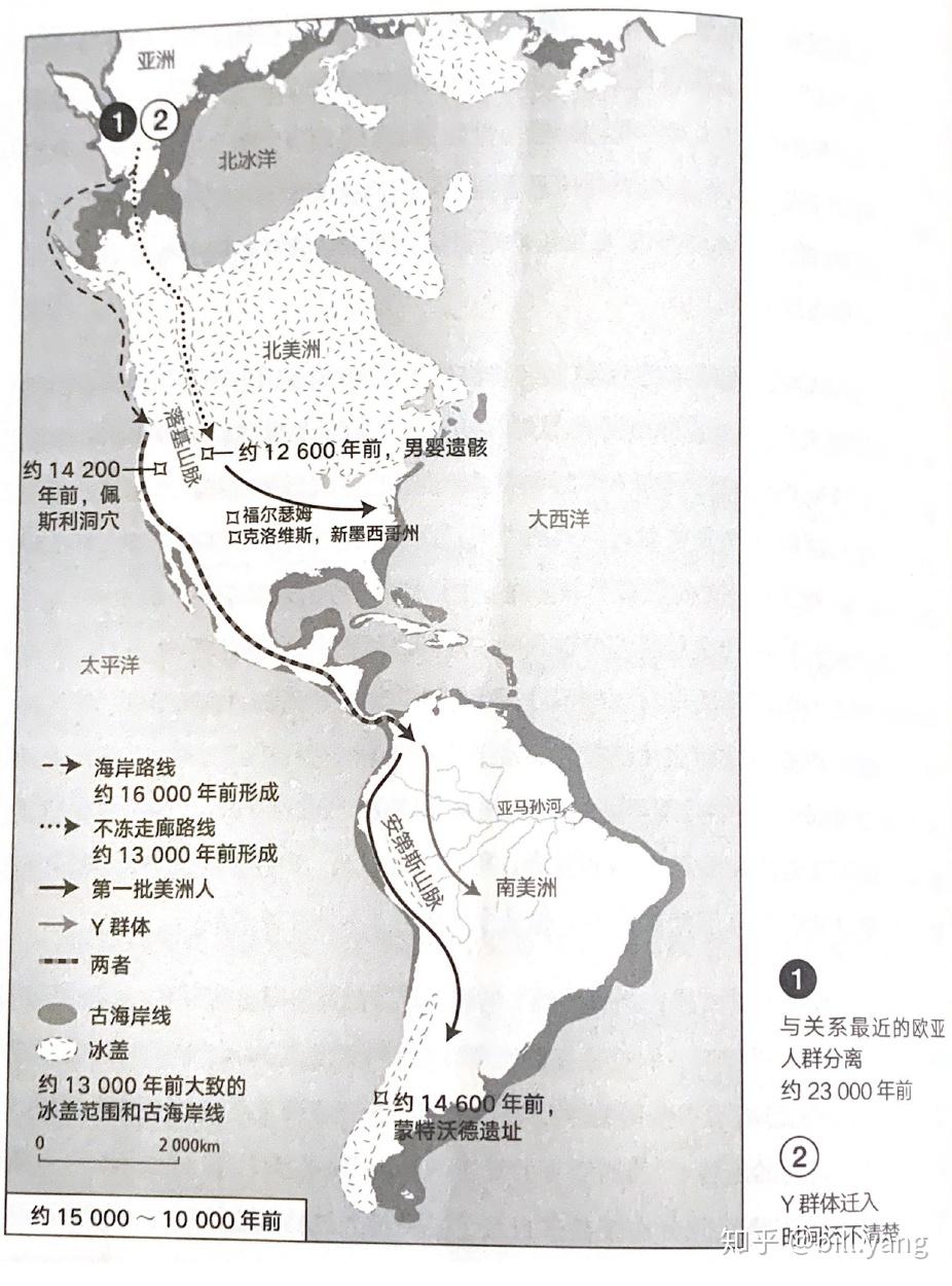 到 大约16000年前,部分海岸线上没有冰了,于是这些先民得以绕开朝南迁徙,到达了冰盖的南边,便是第一批美洲人 ,他们随后开始了极为迅速的扩张,分布到整个美洲大陆。