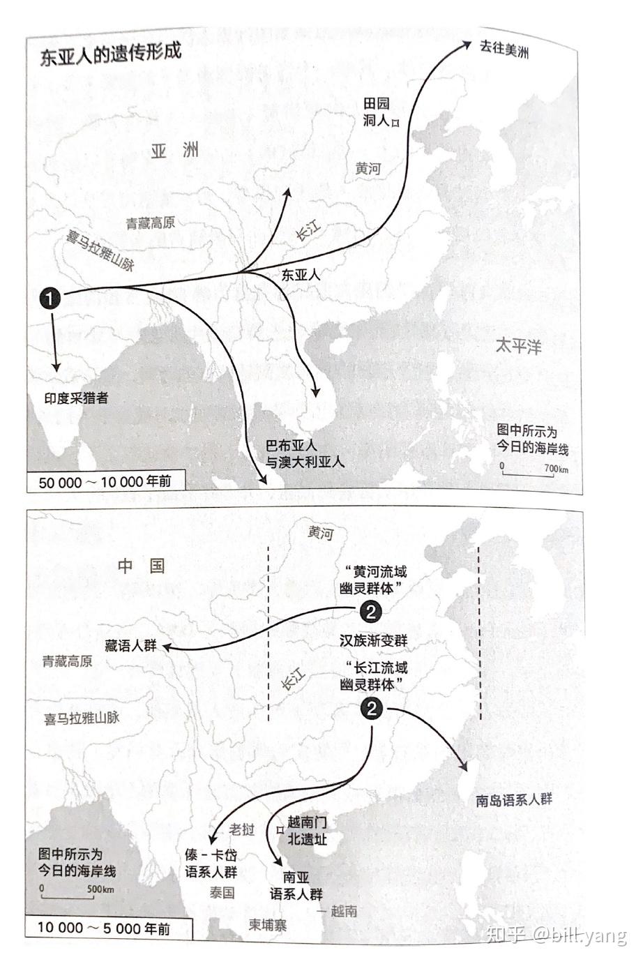 在北方,以黄河流域的农民为核心,演化出后来的汉人,并向西扩张至青藏高原地区, 与当地古老的东亚采猎者发生混血,今天的汉人与藏族人仍有很大部分血统来自同一个祖先群体,但这个群体对东南亚并没有遗传贡献,历史上汉族人的祖先便是从北往南扩张,并不断与当地人混血,所以呈现一个从北向南的梯度性差异。