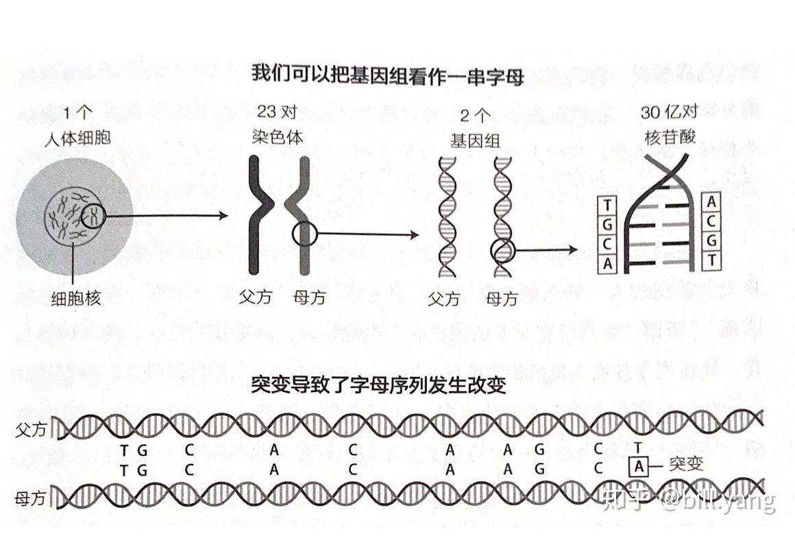 基因记录着我们从父母那里继承的所有遗传密码,首先,每个人都会从父母那各自继承一个基因组,一个基因组内包括23条染色体,他们是由两条长链上的约30亿个化学单元(核苷酸)组成(父母双方的2个基因组,则有60亿个), 每一个化学单元都可以编码为字母表中的A、C、G、T,按照一定的序列存在,通常所说的“基因”事实上指的只是这个链条上的微小片段,大约1000个字母。