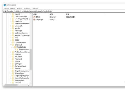 2.依次翻阅左边条目到HKEY_CURRENT_USER\Software\OriginLab\Origin9.6b位置,确保左边选中了Origin9.6b,然后在右侧空白处右键-新建-字符串值,将左侧文字修改为“Language”意思是修改语言;