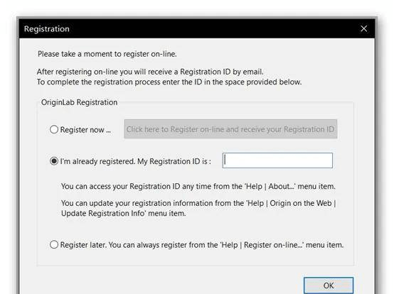 11.双击打开桌面上origin的快捷方式。首次打开时弹出的窗口直接点击确定。在软件中点击Help-Registeron-line,在I’malreadyregistered.MyRegistrationIDis选项中输入:GRM-RVR-AR2,点击“OK”,提示成功即可。