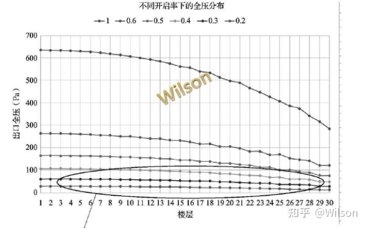 牟飞等人为了佐证自己的观点,通过CFD仿真模拟,对公共烟道排烟系统进行研究,假设每一楼层烟机最大的排风量为500立方米每小时,下图表示了各楼层油烟机不同开启率下不同楼层的公共烟道压力分布。有如下两个结论: