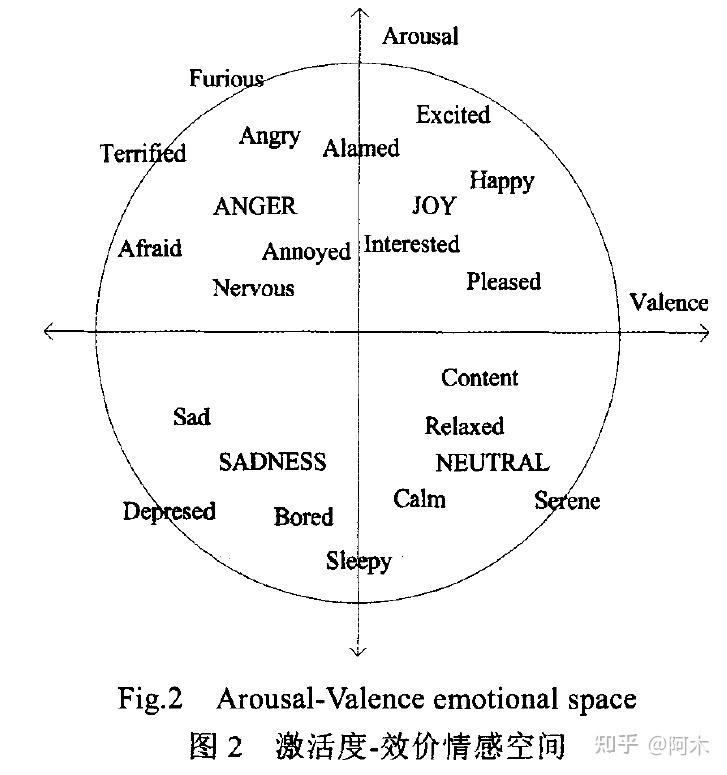 二维度情感描述模型:效价−唤醒二维模型(valence-arousal, VA) (即: 激活度效价空间理论)如下图所示: