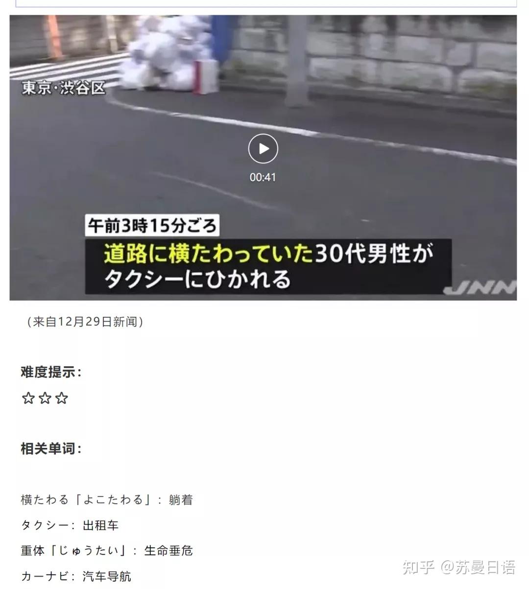 苏曼日语的“新闻听力”栏目,一般会配1分钟左右的当日(或近日)新闻视频,话题囊括日本近期最新时政、民生话题,而且配有 重点单词、原文及假名标注 ,可以说是非常方便的。