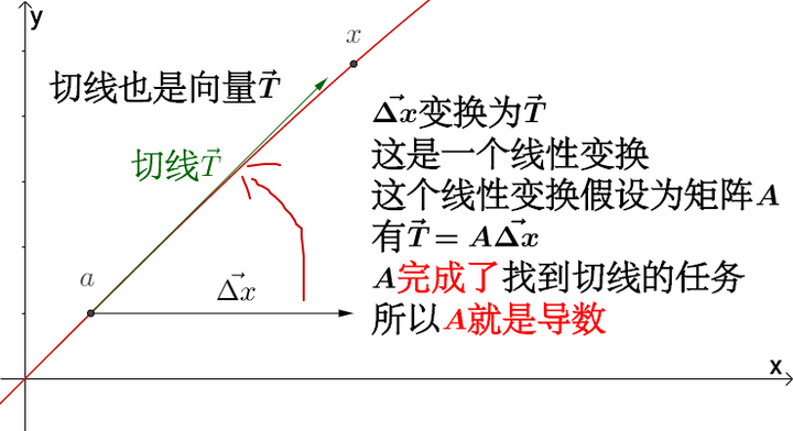 注意,有一点需要特别说明的是,因为矢量的起始点要求是在原点,但是我上面把起始点放在 a 点了,所以实际上是仿射变化,所以实际上 \vec{T}=A\vec{x}+\vec{a} , A 仍然是导数。
