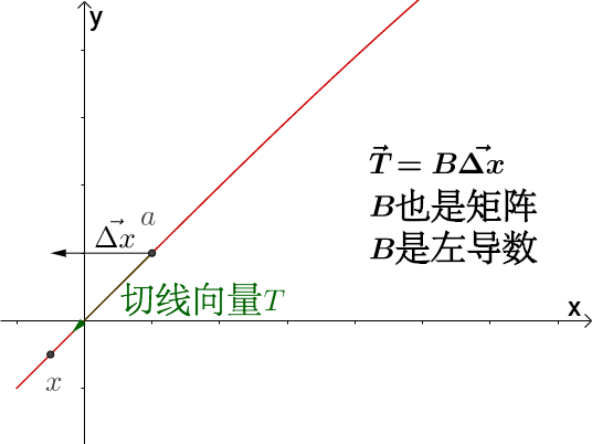 上图的 \vec{\Delta x} 指向右边,实际上求出的 A 是右导数,我换个方向就可以求出左导数: