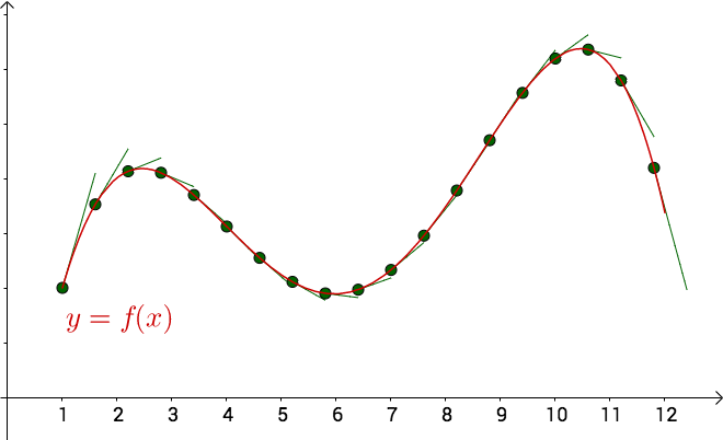 我觉得下面这幅图也挺有意思,如果在曲线上多选几个点,都作出附近的切线,我们可以透过切线看到曲线的轮廓: