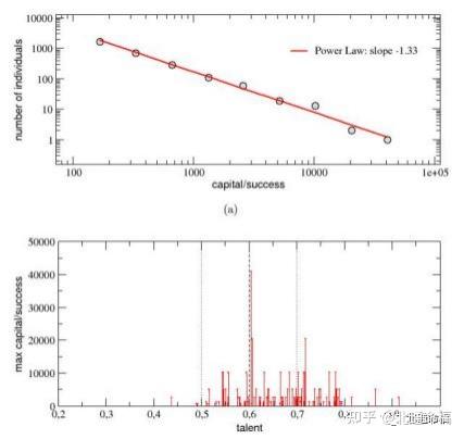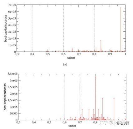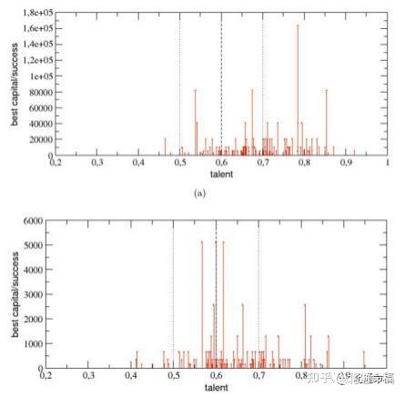 比比他更有才华的人的平均资本/成功程度高几倍。我们可以得出这样的结论,如果一 些人的巨大成功背后没有非凡的才能,另一个因素可能在起作用。我们的模拟清楚地 表明,这样一个因素纯粹是运气。