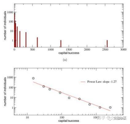 图3 . 资本/成功在人口中的最终分布,包括在(a)对数-林和(b)对数-对数尺度上。尽管人才呈正态分布,但 成功分布的尾部可以在面板(b)中看到,可以用斜率为1的幂律曲线很好地绘制出来。2 7 . 我们还证实,资本/ 成功分配遵循帕累托的\80-20“规则,因为20%的人口拥有80%的总资本,而剩下的80%拥有20%的资本。