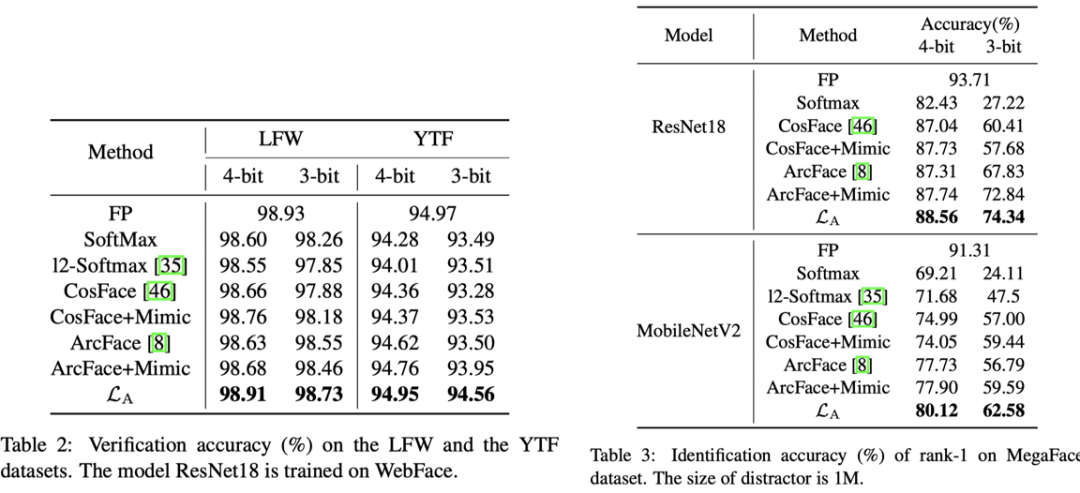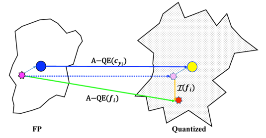 由于开集问题里测试集中存在训练集不存在的类别,因此识别任务比分类任务更难,评价指标也更加严格。而引入量化之后,也就面临着更大的挑战。为了深入分析人脸识别受量化的影响,论文首先基于人脸特征使用夹角度量作为相似度衡量的共识定义了量化误差,并定义量化后的类中心为属于该类所有样本特征进行量化后的均值。对量化误差进行分析,发现引入量化后每个类的中心都有所偏移,但类之间的夹角保持住了,类内的距离保持的较差。可以理解成各类在量化后产生了一个整体的旋转,每个类的紧凑性有所下降。