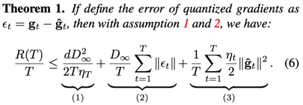 发现了梯度的特征后,我们从理论角度进行了分析,借鉴了优化理论中的后悔值分析。推导出了引入梯度量化之后的收敛性上界: