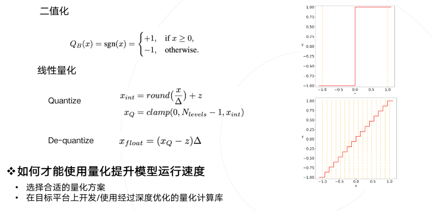 量化是指将信号的连续取值近似为有限多个离散值的过程。可理解成一种信息压缩的方法。在计算机系统上考虑这个概念,一般用“低比特”来表示。也有人称量化为“定点化”,但是严格来讲所表示的范围是缩小的。定点化特指scale为2的幂次的线性量化,是一种更加实用的量化方法。