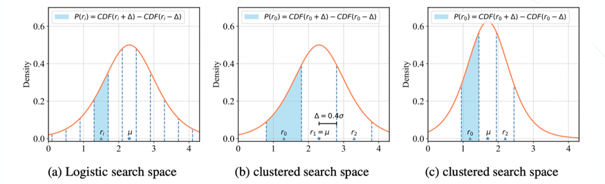 这启发了我们,是否存在一些模型结构,他们对于量化更加友好呢?本文从卷积核output channel的角度进行了探索,将量化背景下的channel探索转换为网络结构搜索(NAS)问题。Channel的搜索空间一般较大,直接使用已有的NAS会面临非常高的搜索复杂度,为了解决这个问题,本文提出了搜索空间聚类方法。首先将channel的变换参数r建模为服从Logistic分布的随机变量,广义的搜索空间可以认为是从该分布中进行采样,我们将采样限制为三个点:(),由于Logistic分布的分布函数可以进行求导,和能够进行优化,同时我们将进行衰减,即可最终收敛到上,作为最优的channel放缩系数。