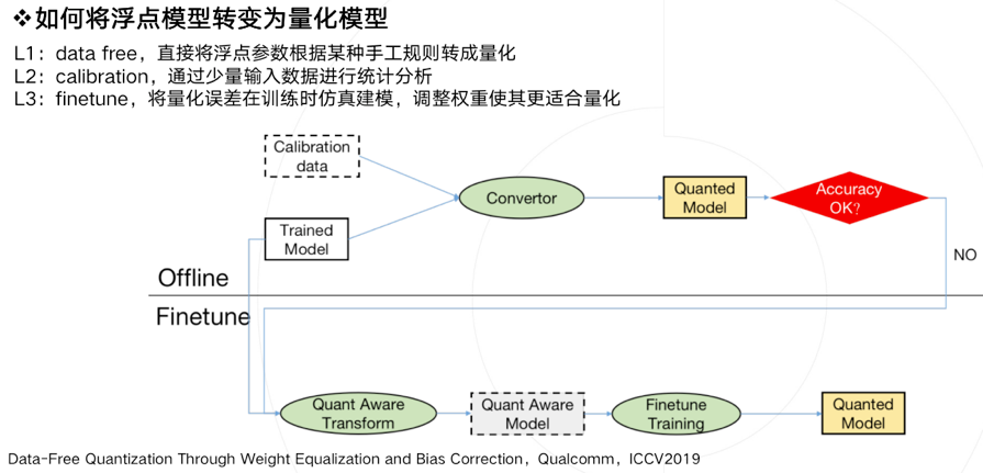上图描述了一种实用的pipeline流程,一般会优先使用不进行finetune的offline方法,也就是离线方案。当离线方案精度损失过于严重,我们才会进行基于finetune的方法,来做进一步的抢救。