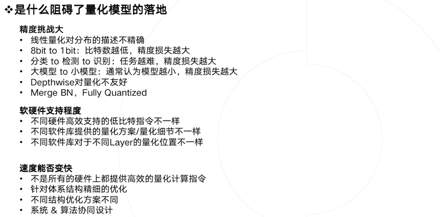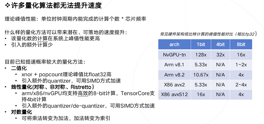 除了精度外,软硬件支持不好也是一个阻碍:不同的硬件支持的低比特指令是不一样的,同样训练得到的低比特模型,无法直接部署在所有硬件上。除了硬件之外,不同软件库实现的量化方案和细节也不一样,量化细节里包括量化位置、是否支持perchannel、是否混合精度等等。即使硬件支持了量化,但你会发现不是所有硬件可以在低比特上提供更好的速度提升, 造成这个状况的主要原因有多个,一方面是指令集峰值提升可能本身就并不多,而要引入较多的额外计算,另一方面也取决于软件工程师优化指令的水平,同时由于网络结构灵活多样,不一定能在不同网络结构上达到同样好的加速比,需要优化足够多的的corner case才可以解决。