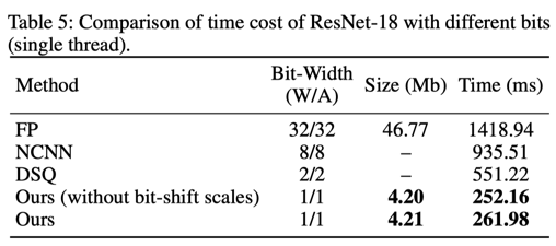 同样在树莓派上进行了速度验证,借助京东开源的daBNN推理库,测试了IR-Net的性能,相比daBNN中的全精度模型,大约有5.6倍左右的速度提升。