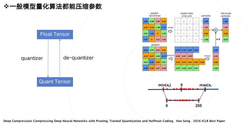 模型量化在最初的定义里是为了压缩模型参数,比如韩松在ICLR2016上获得best paper的论文,首次提出了参数量化方法。其使用k-mean聚类,让相近的数值聚类到同一个聚类中心,复用同一个数值,从而达到用更少的数值表示更多的数,这是量化操作的一种方案。反过来,从量化数变到原始数的过程,称之为反量化,反量化操作完之后,模型就可以按照原来的方式进行正常的计算。