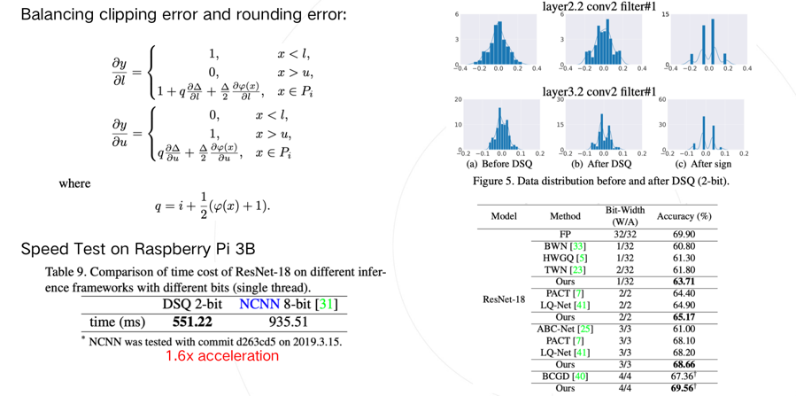 通过可视化分析,我们发现经过DSQ函数后,参数的分布更加接近于量化后的分布,减小了浮点参数和量化参数的鸿沟。为了验证这套方法的效率,我们基于ARM NEON中的SADDW和MLA指令实现了高效的低比特卷积,并在树莓派上以ResNet-18为基础进行测试,相比腾讯开源的高性能推理库NCNN有1.6倍左右的提速。