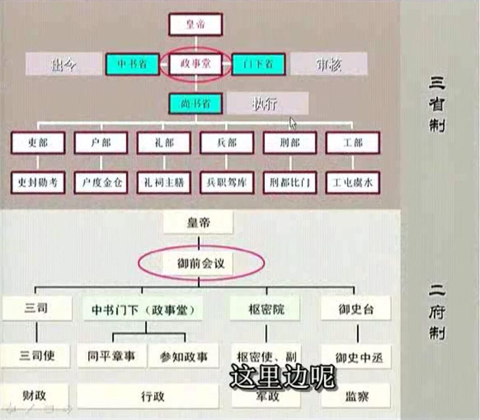而宋朝按照事情分工,中书门下管行政,枢密院管军政,三司管财政,御史台管监察,所有决策→拍板→执行都是一个部门负责到底,且君权加强(宰相们讨论政事都是在御前会议,皇帝也在场,所有部门都直接向皇帝负责)所以宋朝几乎没有内朝问题,也就没有出现制衡的机构