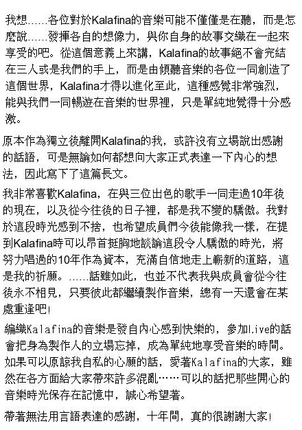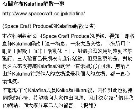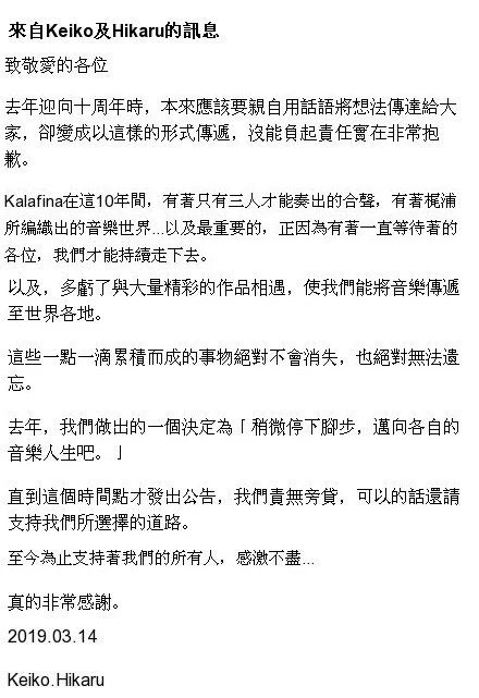 3月13日,日本歌唱组合Kalafina所属事务所SPACE CRAFT,在官方网站上宣布Kalafina解散:“虽然目前一直在探讨活动重开的可能性,但Kalafina成员表示重新开始活动十分困难。”