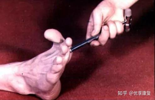 检查方法:仰卧位,一只手固定检查侧踝部,用棉签轻划病人足底的外侧缘,从足跟向足趾方向划,当划至小跖根部隆起处,转向内侧。引发足趾屈曲。