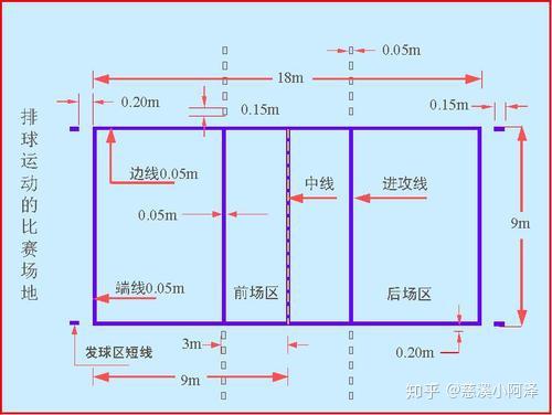 排球比赛场地为18米×9米的长方形 ,四周至少有3米空地,场地上空至少高7米内不得有障碍物。场中间横划一条线把球场分为相等的两个场区。所有线宽均为5厘米。