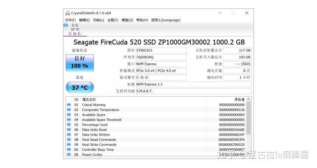 首先依旧使用CrystalDiskInfo对硬盘参数进行确认。希捷 FireCuda 520 SSD 1000 GB固盘,传输模式支持PCIe 4.0 x4,支持NVMe 1.3协议,通电次数8次。这里之所以是8次,是因为前面有进行绿联M.2硬盘盒的安装与Symantec Ghost的系统克隆操作。